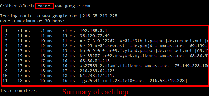 The command outputs a line-by-line summary of each hop, including the latency between your system and that particular hop. Also provides the IP address and domain name (if available) of the hop.