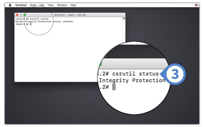• In order to check if System Integrity Protection is currently enabled or disabled, make use of the command csrutil status.