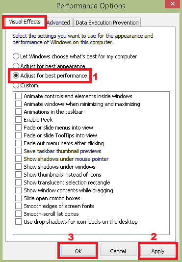 iv. Now, choose Adjust for best performance under Visual Effects to disable all the animations and click Apply, then OK.
