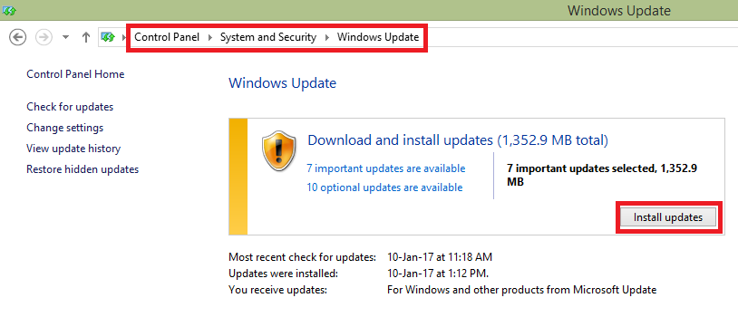 To update Windows, go to Control Panel > System and Security > Windows Update and click Install updates.